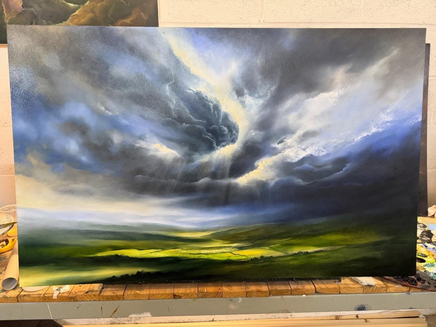 “When Hope Shone Down” captures the breathtaking moment when a storm breaks open to reveal a burst of celestial light. Dark, swirling clouds gather with dramatic force, yet through the heart of the sky pours a radiant beam that spills across the rolling fields below. The land glows in rich greens and golds, transformed by the touch of light. This piece speaks of endurance, renewal, and the quiet miracle of hope arriving exactly when it’s needed.